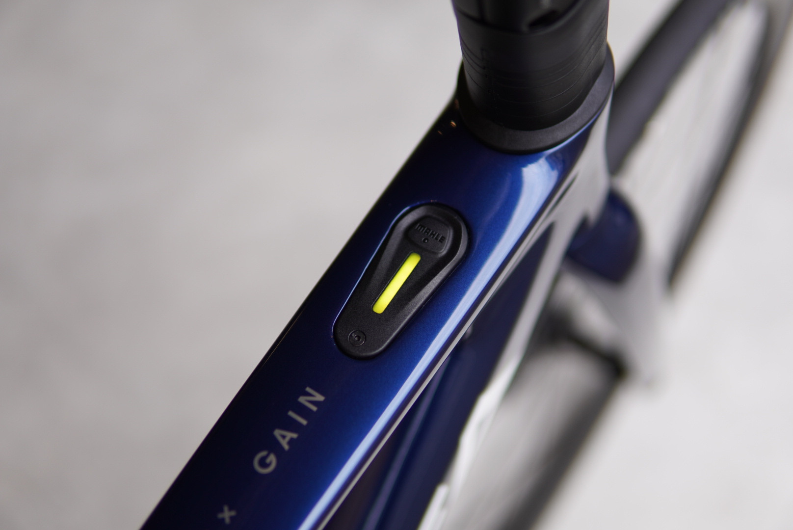 e-BIKEであることが分かるのは、トップチューブ上に配置されたスイッチとアシストの強さを知らせるLEDインジケーターくらいかもしれません。
