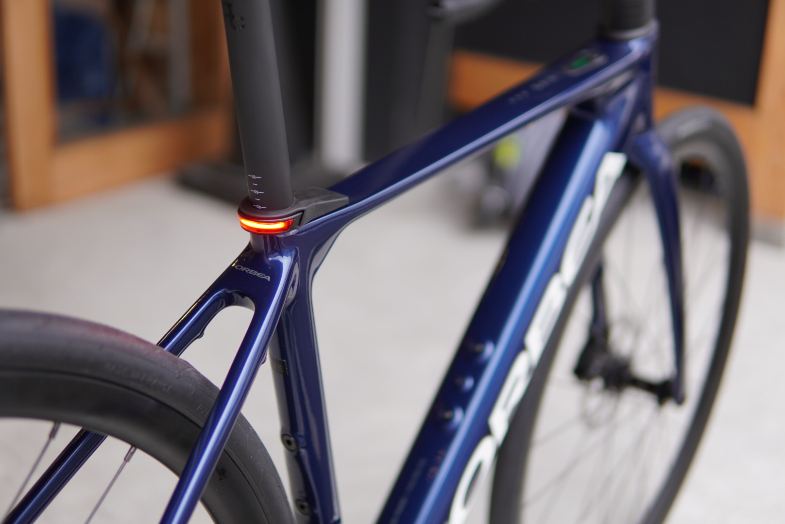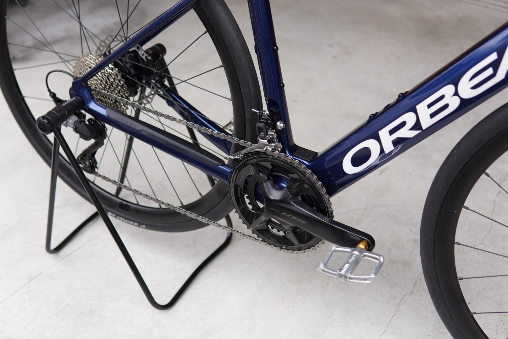昨今のロードバイクらしいボリューム感のある造形のORBEA OMRカーボンフレームに、通常のロードバイク用コンポーネントである105を装備。
