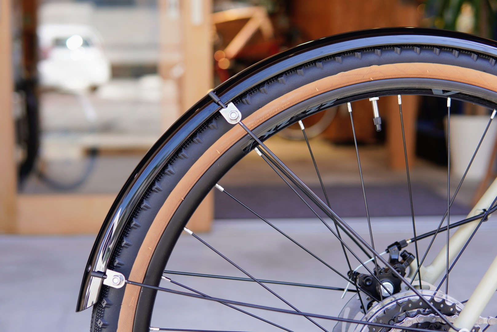 街乗りでも扱いやすいよう、ドロヨケはフルフェンダータイプをタイヤに寄せてセッティング。