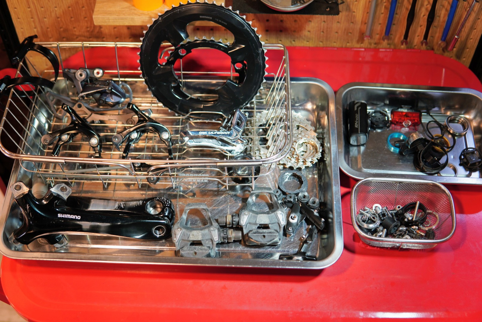 オーバーホールでは、フレームからコンポーネントをすべて取り外して分解・洗浄。